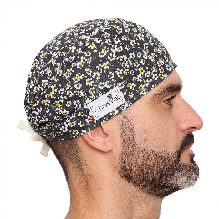 Alliez élégance et confort avec le calot court Désir, une charlotte médicale lavable conçue pour sublimer votre tenue professionnelle. Ce modèle raffiné signé ChrysVal présente un fond noir élégant parsemé de petites fleurs blanches et jaunes, pour un look à la fois sobre, féminin et distingué. Idéal pour tous les professionnels de santé à la recherche d’un bonnet de bloc chic et confortable.