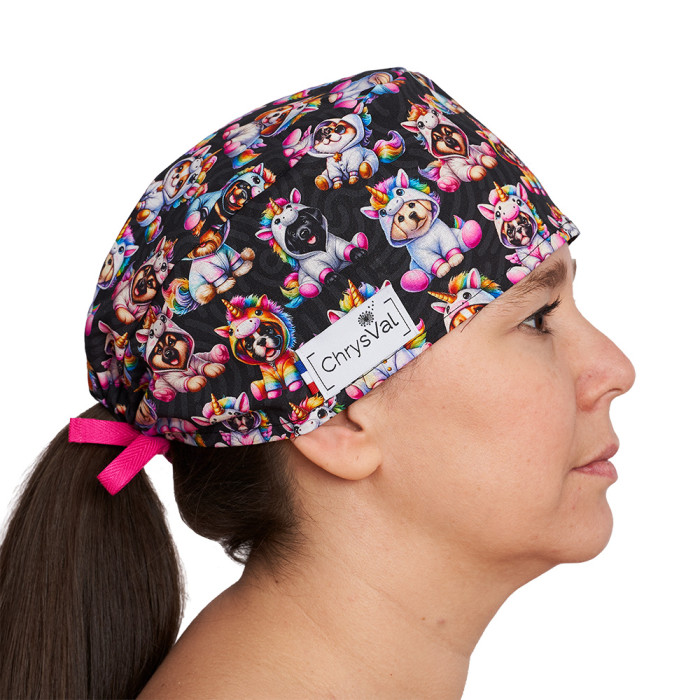 Le calot court Dogi’Corn associe fond noir élégant et motifs multicolores éclatants. Les chiots licornes aux crinières arc-en-ciel et détails rose vif apportent une touche joyeuse à votre uniforme professionnel.