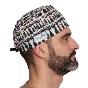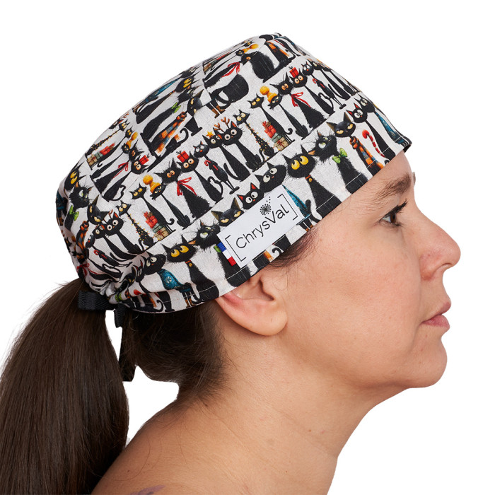 Le calot court "Le Chat Noir" est une charlotte médicale lavable sur fond blanc décoré de chats noirs stylisés aux yeux lumineux, rehaussés de petites touches colorées. Un modèle original et élégant.