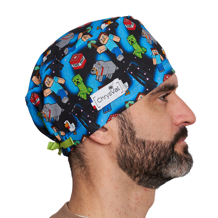 Entrez dans l’univers pixel et aventure avec le calot couvrant Pixel Adventure. Inspiré du célèbre jeu de construction, ce modèle met en scène personnages cubiques, créatures emblématiques et blocs iconiques sur un fond bleu nuit lumineux. Cette charlotte médicale lavable apporte une touche moderne et dynamique à votre tenue professionnelle.
