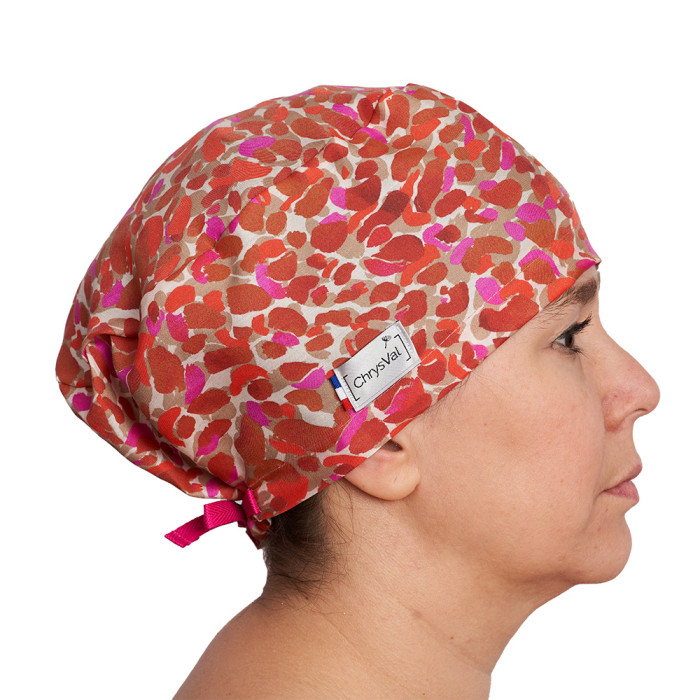 Le calot en soie italienne Soleil Carmin transforme un simple bonnet médical en accessoire signature. Il reflète la vision de ChrysVal : unir élégance, technicité et bien-être dans une création artisanale française.