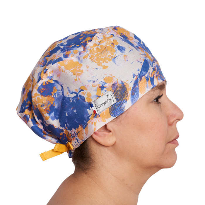Le calot en soie Jardin Indigo est adapté aux professionnelles exerçant hors bloc opératoire :